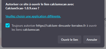Sélectionnez là, cochez la case « Toujours autoriser https://calciul.univ.fr à ouvrir les liens calciumscan » et enfin cliquez sur le bouton « Ouvrir le lien« .