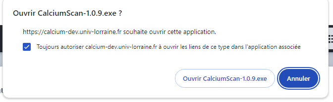 Cochez la case « Toujours autoriser calcium.univ.fr à ouvrir les liens de ce type dans l’application associée » et cliquez sur le bouton « Ouvrir CalciumScan«