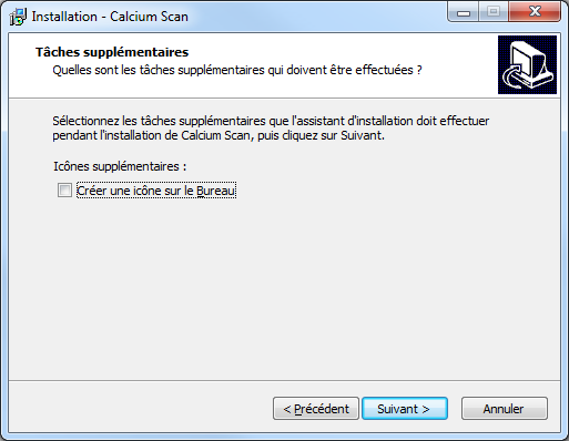 Par défaut, la création d’une icône sur le Bureau n’est pas activée. Choisissez si oui ou non il faut un raccourci sur le Bureau, puis Suivant
