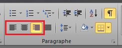 Pour aligner une cellule, à gauche, à droite ou au centre, il faut sélectionner la cellule en question et choisir l’alignement situé dans le panneau « Paragraphe« .