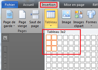 Cliquer sur « Insertion » puis sur « Tableau« . Enfin, choisissez le nombre de lignes et de colonnes voulues.