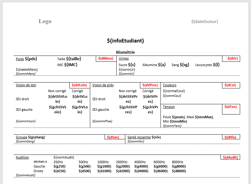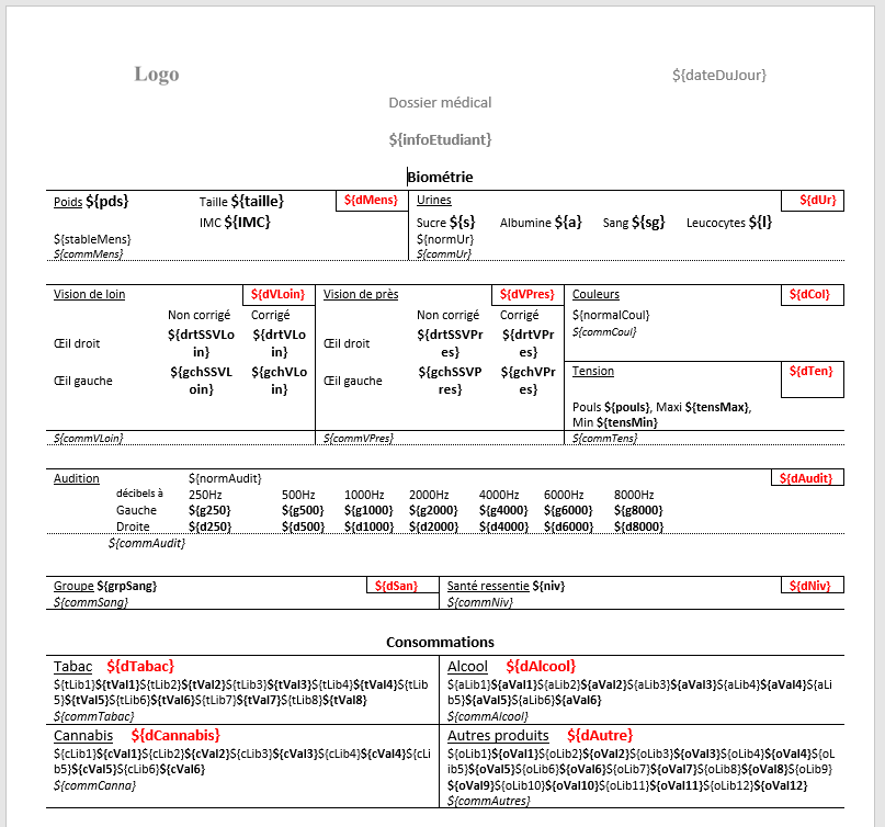 Ici, chaque balise correspond à un élément de la fiche Biométrie (${taille} correspond à la Taille, …) et de la fiche Consommations.