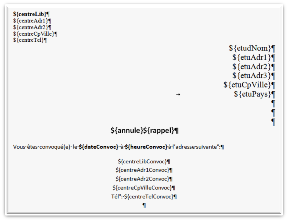 | ${centreLibConvoc}, …, ${centreTelConvoc} | Informations sur le centre où la convocation doit avoir lieu (cf balises) |
