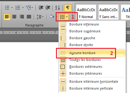 Dernière étape, la plus importante, est d’enlever les bordures du tableau. Pour cela, il faut sélectionner entièrement le tableau, puis, dans le panneau « Paragraphe« , sur l’outil bordure [1], cliquer sur « Aucune bordure » [2].