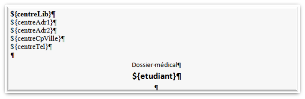 | ${centreAdr1} | Adresse (1ère ligne) du centre courant |