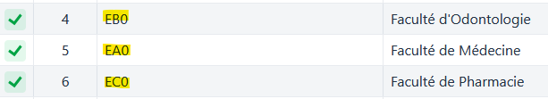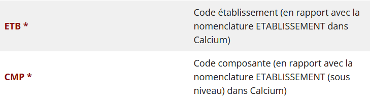 Afin que Calcium puisse associer l’étudiant au bon établissement et à la bonne composante, il faut s’assurer que les codes de références de la base de scolarité se retrouvent dans la nomenclature établissement de Calcium.