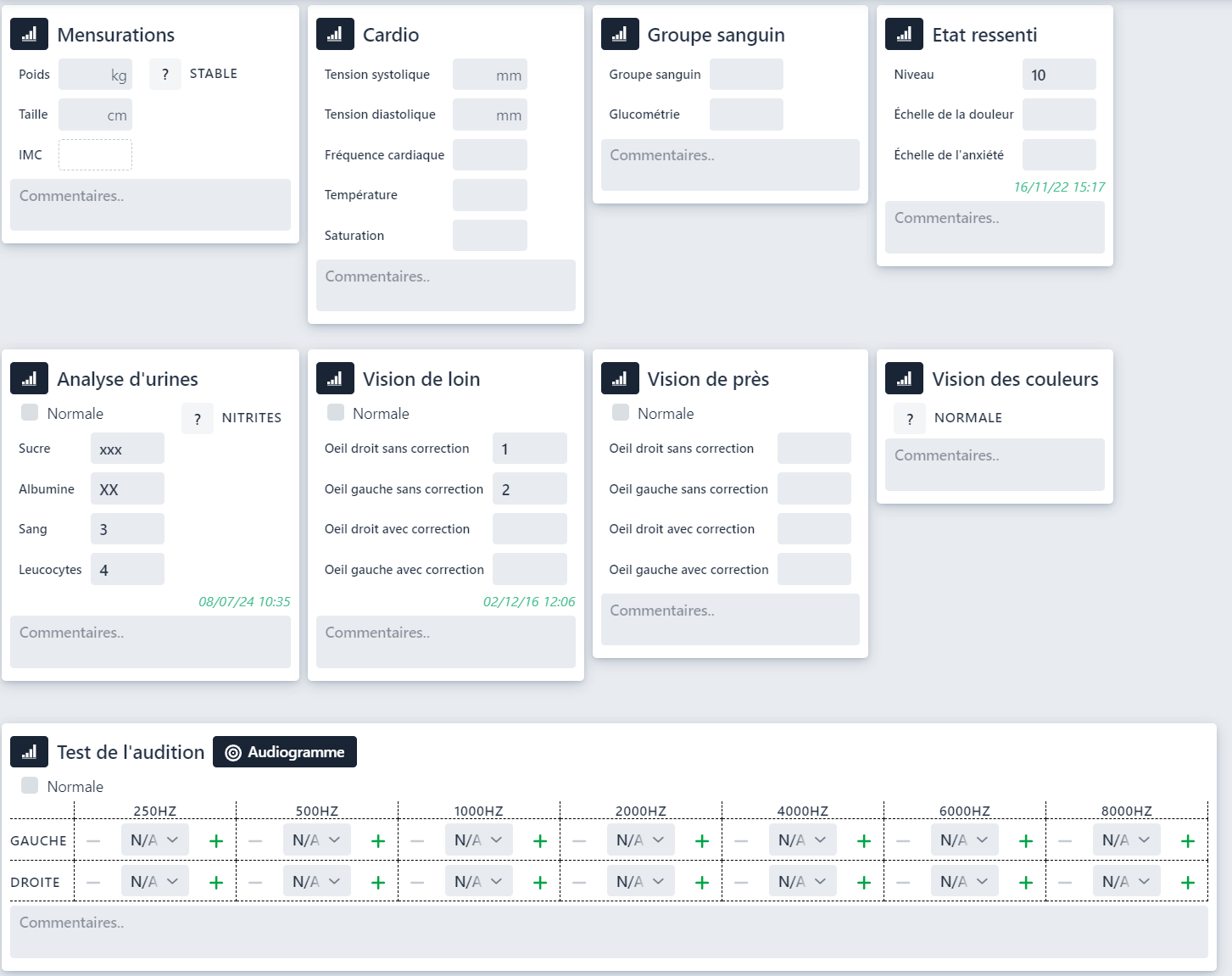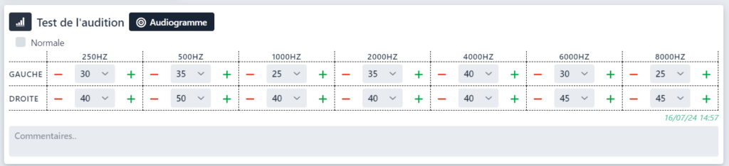 La partie Test de l’audition permet de saisir les données issues d’un test d’audiométrie.