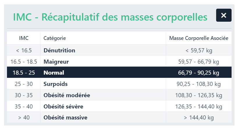 Un tableau récapitulatif permettant de voir, à condition ques les données soient saisies, où se situe l’IMC de l’étudiant est disponible via le bouton situé dans la barre du haut.