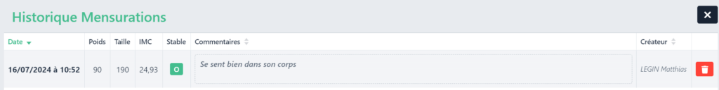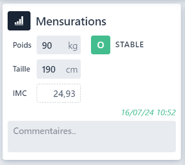 Dans le bloc Mensurations, les données disponibles sont le poids et la taille. L’IMC se calcule automatiquement.