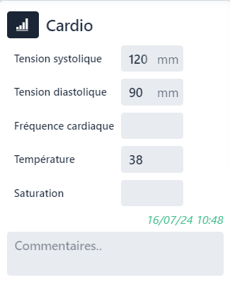 Dans le bloc Cardio, les données concernées sont les tensions systolique et diastolique qui doivent s’exprimées en mm. Il est possible de remplir la fréquence cardiaque, la température ainsi que la saturation qui sont en saisie libre.