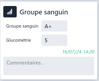 Le bloc Groupe Sanguin donne les informations par rapport au groupe sanguin et la glucométrie (taux de glycémie). Ce sont des champs en saisie libre.