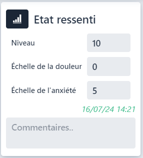 Le bloc Etat ressenti prend en compte le niveau de l’état ressenti de l’étudiant, l’échelle de la douleur et l’échelle de l’anxiété. Ce sont des champs en saisie libre.