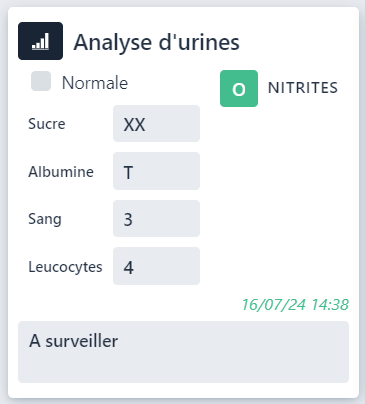 Le bloc Analyse d’urines permet de noter les informations liées au résultat de cette analyse comme le taux de sucre, d’albumine, de sang et de leucocytes. Une case à cocher existe pour indiquer si l’analyse est normale. Une autre existe également pour indiquer ou non la présence de nititres.