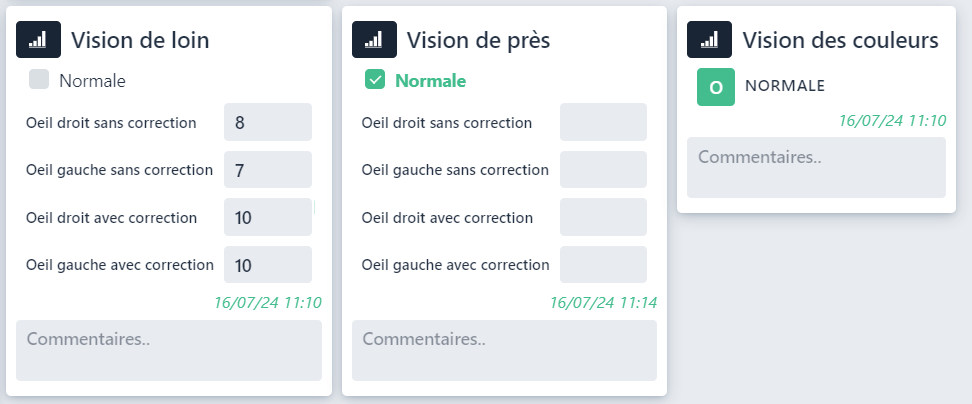 Les blocs Visions de loin, Vision de près et Vision des couleurs permettent de préciser les degrès de corrections éventuelles en rapport avec la vision de l’étudiant.