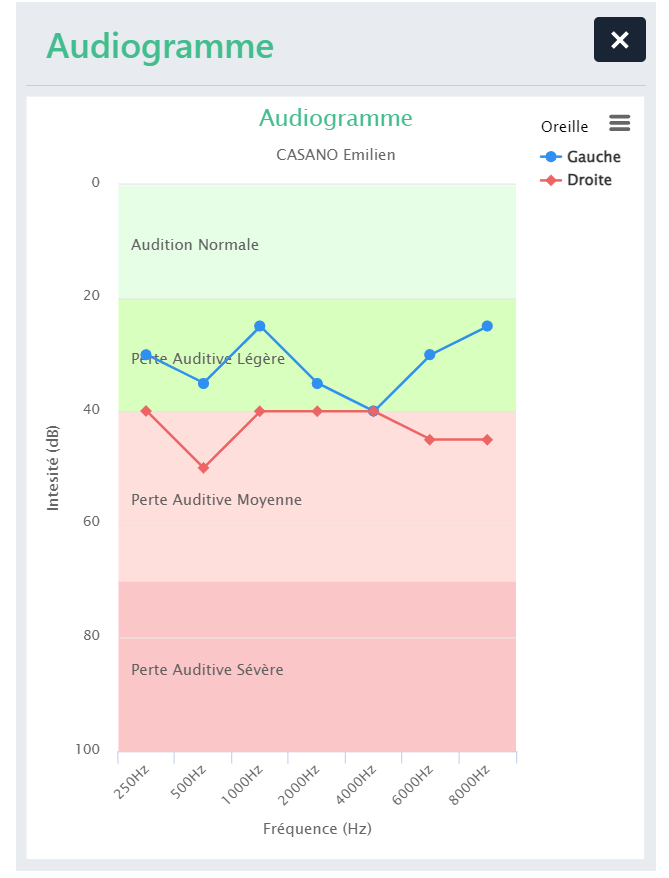 Via le bouton Audiogramme associé, l’intervenant peut obtenir un audiogramme, imprimable le cas échéant via le bouton