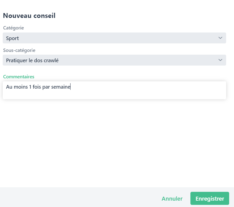 Pour ajouter un nouveau conseil, il suffit de cliquer sur le bouton +Nouveau et de remplir l’encart suivant :