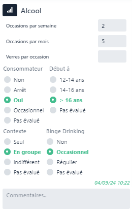 Le bloc Alcool indique les habitudes de consommation d’alcool de l’étudiant.
