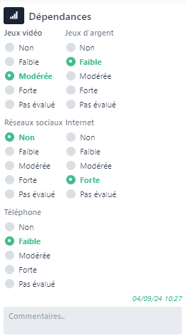 Le bloc Dépendances évalue l’addiction de l’étudiant à différentes activités comme les jeux d’argent, les jeux vidéo, les réseaux sociaux, internet ou encore le téléphone.