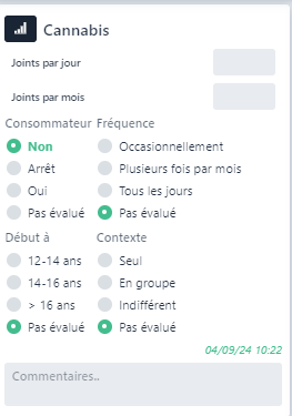 Le bloc Cannabis indique si l’étudiant consomme du cannabis et à quelle fréquence.