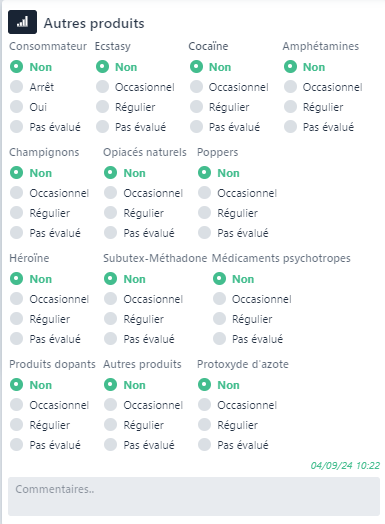 Le bloc Autres produits permet à l’intervenant de noter la consommation d’autres produits comme l’exstasy, cocaîne, poppers, protoxyde d’azote et autres.