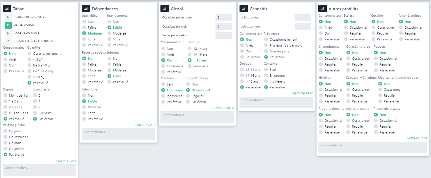 La fiche Consommation est un questionnaire à propos de la consmmation de tabac, d’alcool, de cannabis et autres produits ainsi que de certaines dépendances.