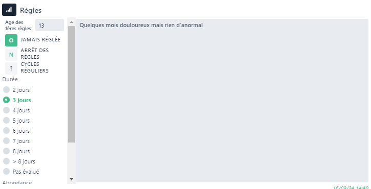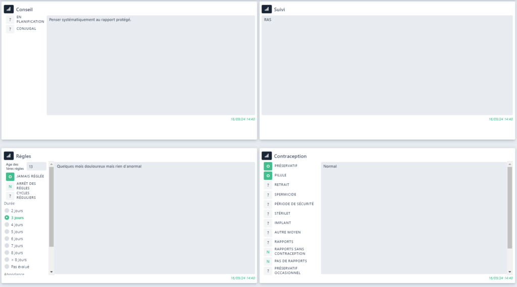 Les quatre blocs de cette fiche permettent de faire des annotations par rapport à différents aspects d’ordre gynécologique.
