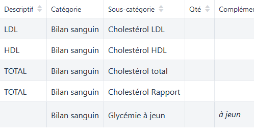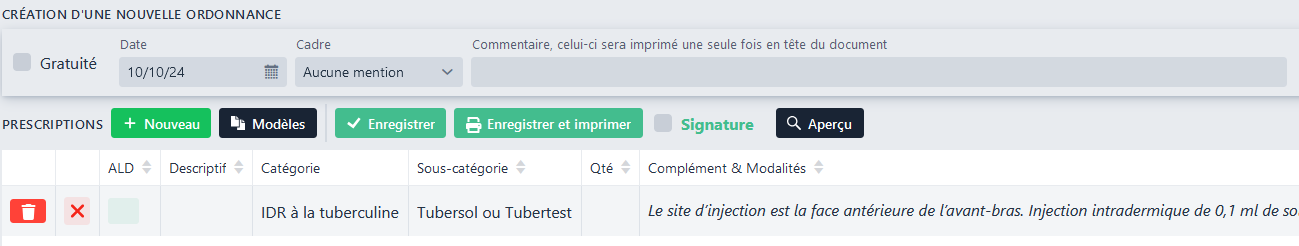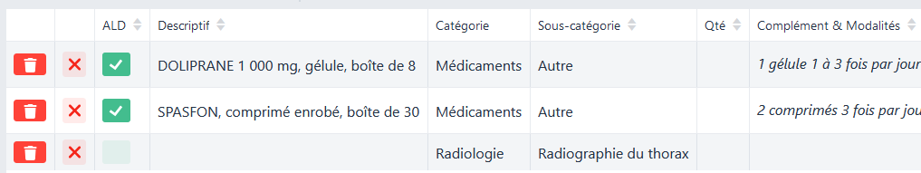 Vos prescriptions apparaissent dans le tableau, avec la possibilité de les modifier en cliquant dessus ou de les supprimer via le bouton