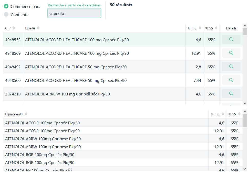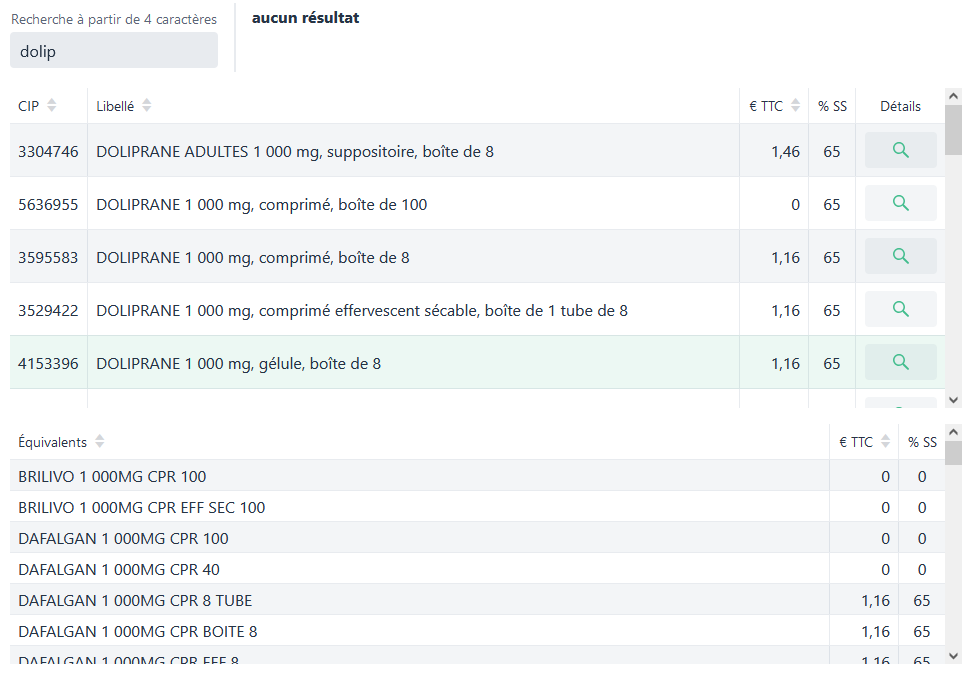 En cliquant, une seule fois, sur un résultat, il est possible de récupérer les équivalents du médicament choisi, dans le tableau en bas de la fenêtre.