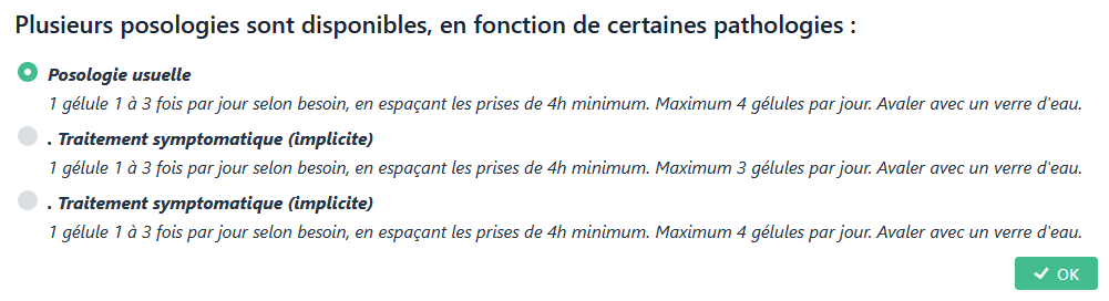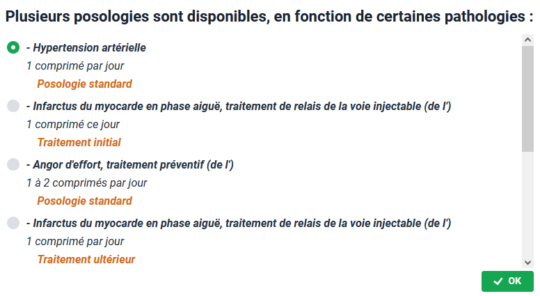 En double cliquant sur un résultat, il est possible de choisir la posologie du médicament si celui ci en comporte.