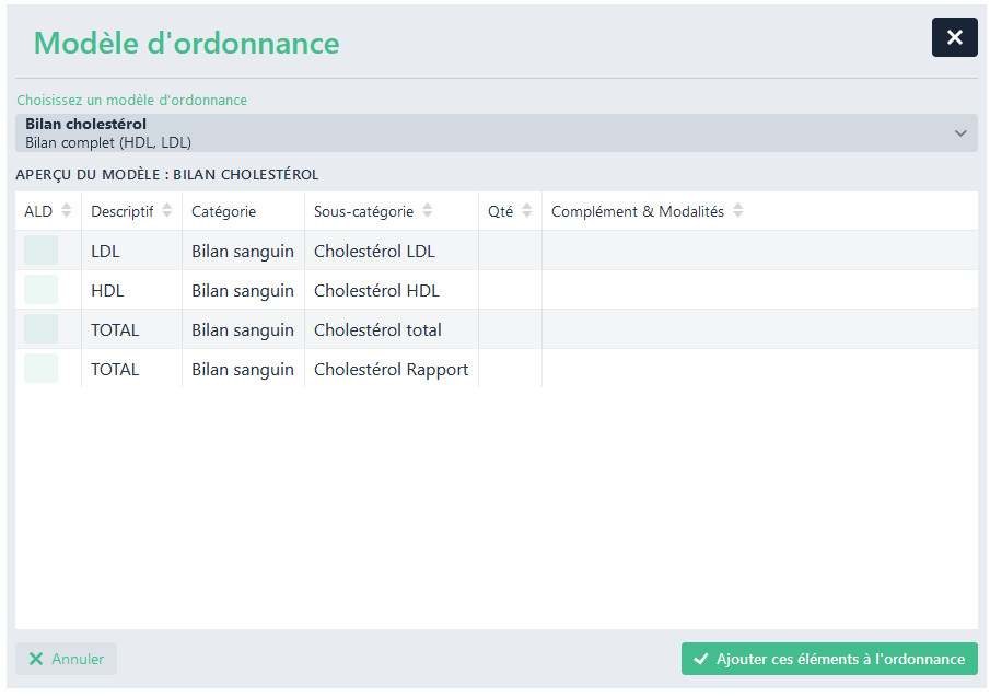 ajoute la totalité des prescriptions correspondantes dans le tableau standard d’édition des ordonnances. Il est alors possible d’éditer l’ordonnance, avec ou sans modification.