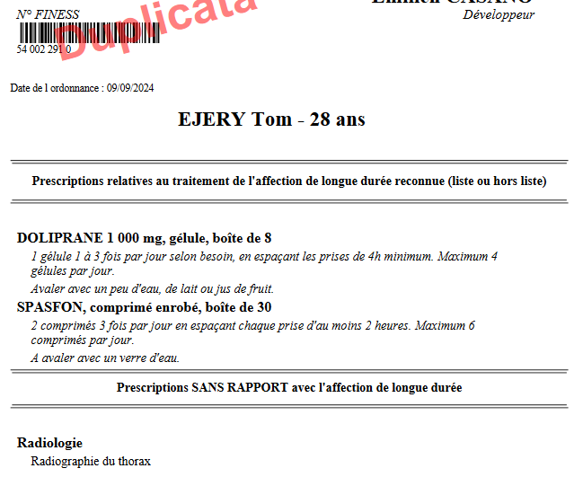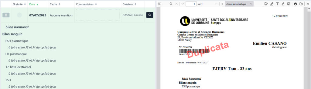 Cette action permet de imprimer l’ordonnance avec un tampon DUPLICATA.