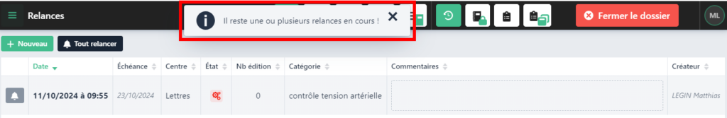 Lors de l’ouverture d’un dossier en consultation, si le dossier en question possède une ou des relances en cours non échues alors une fenêtre d’information s’affichera et la fiche Relance sera automatiquement ouverte.