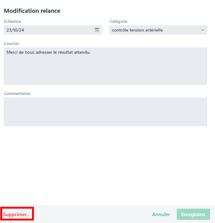 L’intervenant peut vouloir supprimer une relance qui n’a plus lieu d’être si cela est justifié pendant une consultation de l’étudiant par exemple.
