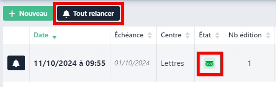 L’intervenant peut éventuellement basculer l’état des relances qui ont été envoyées (témoin lettre verte) à l’état non édité (témoin engrenage rouge) via un clic sur le bouton « Tout relancer ». Un nouveau mail pourra alors être renvoyé à l’étudiant (c’est le mail de rappel).