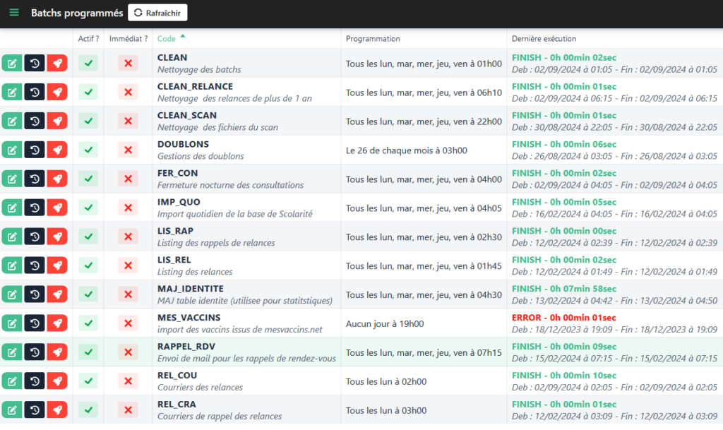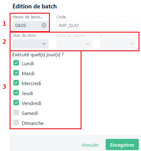 Cette page permet de programmer de façon automatique les traitements automatisés (batchs). Cela permet notamment de définir l’heure et les jours auxquels ces tâches doivent se lancer.