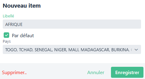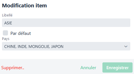 En double cliquant sur la ligne que vous souhaitez modifier, une fenêtre s’ouvre. Vous aurez alors la possibilité de modifier le libellé ou bien ajouter ou enlever un pays de la liste.