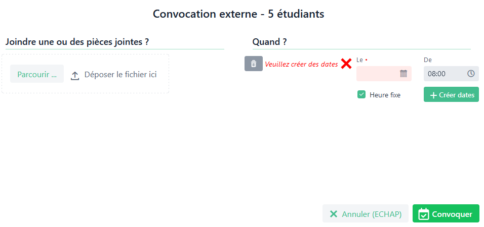 En cochant la case « Heure fixe », il est possible de choisir une heure commune où les étudiants seront convoqués.