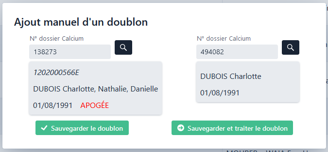 - d’ajouter manuellement un doublon , si vous avez identifié de votre côté 2 dossiers Calcium en double alors qu’ils n’apparaissent pas dans la liste des doublons