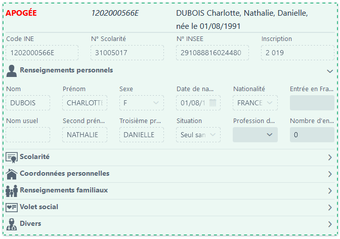 Si le modèle d’importation du dossier le permet, vous avez la possibilité de modifier les informations personnelles de l’étudiant avant la fusion. Ainsi, vous pourrez récupérer des informations que vous avez noté lors de la création du dossier qui n’a pas été récupéré par Apogée.