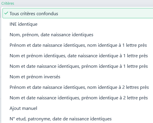 A partir de la boite de sélection « Critères », vous pouvez affiner la recherche de vos doublons potentiels à partir des critères de rapprochement les plus fréquemment observés: