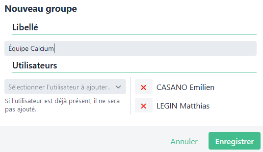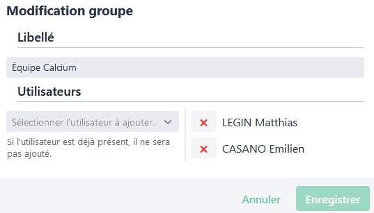 Vous pouvez alors modifier le libellé, ajouter d’autres utilisateurs ou supprimer un utilisateur du groupe en cliquant sur la croix rouge