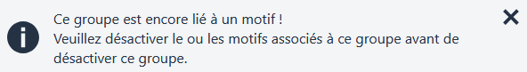 Si le groupe est encore lié à un motif, un message apparaît pour vous prévenir de modifier ou désactiver le motif qui sont liés à ce groupe.