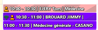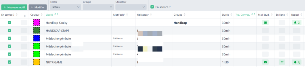 Depuis la liste, vous pouvez voir d’un coup d’œil les informations importantes, le libellé, qui est lié au motif, la durée, ou encore les différentes options (envoi de mail, possibilité d’être pris en ligne ou si un mail de rappel est envoyé).