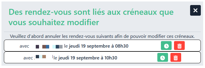 Il se peut que des créneaux, lié au motif sélectionné, ont des rendez-vous en attente. Calcium les détectera et vous proposera soit de les déplacer (si possible), soit de les annuler. Dans les 2 cas, l’étudiant concerné sera averti par mail (si celui-ci à un mail associé) ainsi que les intervenants concernés.