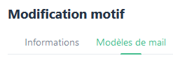 Lorsque vous créer ou modifier un motif, il est possible d’éditer les modèles de mail qui seront utilisés pour ce motif en particulier, via l’onglet « Modèles de mail » situé en haut de la fenêtre.