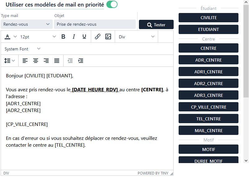 Pour que Calcium utilise ce modèle de mail, il faudra cocher le témoin « Utiliser ces modèles de mail en priorité ». Cela indiquera d’utiliser ces modèles plutôt que ceux définis par défaut dans les Paramètres. Afin notamment d’avoir des mails personnalisés pour un certain type de motif spécifique.