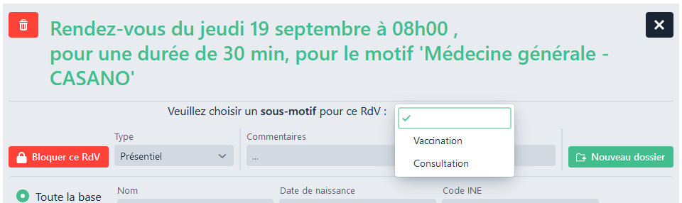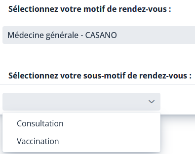 Lors de la prise d’un rendez-vous, il vous sera alors demandé de renseigner le sous-motif correspondant :