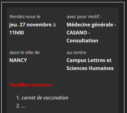Cette option permet l’envoi d’un mail de confirmation à l’étudiant (si celui ci à un mail lié). L’étudiant devra alors confirmer ce rendez-vous en appelant le centre de santé.