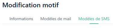 Lorsque vous créer ou modifier un motif, il est possible d’éditer les modèles de SMS qui seront utilisés pour ce motif en particulier, et un type défini de rendez-vous (prise de rdv, rappel, etc), via l’onglet « Modèles de SMS » situé en haut de la fenêtre.