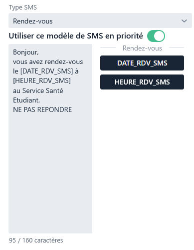 Pour que Calcium utilise ce modèle de SMS, il faudra cocher le témoin « Utiliser ces modèles de SMS en priorité ». Cela indiquera d’utiliser ces modèles plutôt que ceux définis par défaut dans les Paramètres. Afin notamment d’avoir des SMS personnalisés pour un certain type de motif spécifique, pour un certain type de rendez-vous (prise de rdv, rappel, etc).